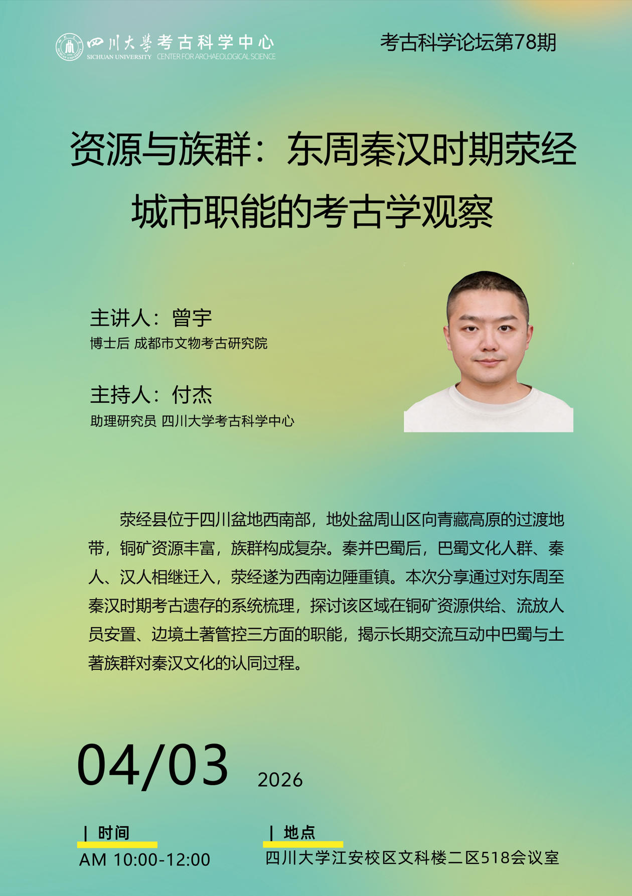 题目:资源与族群:东周秦汉时期荥经城市职能的考古学观察主讲人:曾宇 博士后 成都市文物考古研究院主持人:付杰 助理研究员 四川大学考古科学中心 主讲内容:荥经县位于四川盆地西南部,地处盆周山区向青藏高原的过渡带,铜矿资源丰富,族群构成复杂。秦并巴蜀后,成都平原巴蜀文化人群、秦人、汉人相继迁入,荥经遂为西南边陲重镇。本次分享通过对东周至秦汉时期考古遗存的系统梳理,探讨该区域在铜矿资源供给、流放人员安置...