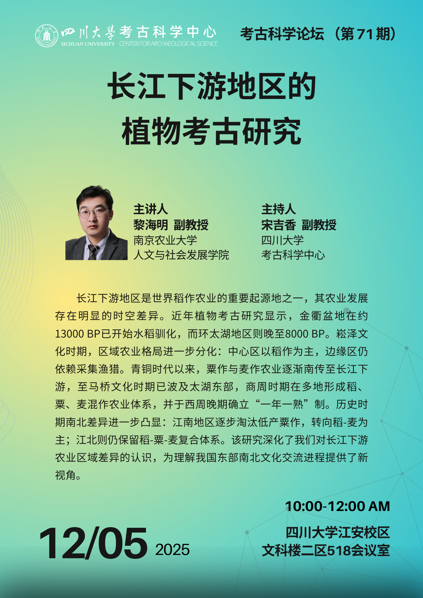 考古科学论坛(第 71 期)长江下游地区的植物考古研究主讲人:黎海明 副教授(南京农业大学 人文与社会发展学院)主持人:宋吉香 副教授(四川大学 考古科学中心)主讲内容简介:长江下游地区是世界稻作农业的重要起源地之一,其农业发展存在明显的时空差异。近年植物考古研究显示,金衢盆地在约13000 BP已开始水稻驯化,而环太湖地区则晚至 8000 BP。崧泽文化时期,区域农业格局进一步分化:中心区以稻作为主,边缘区仍依赖采...