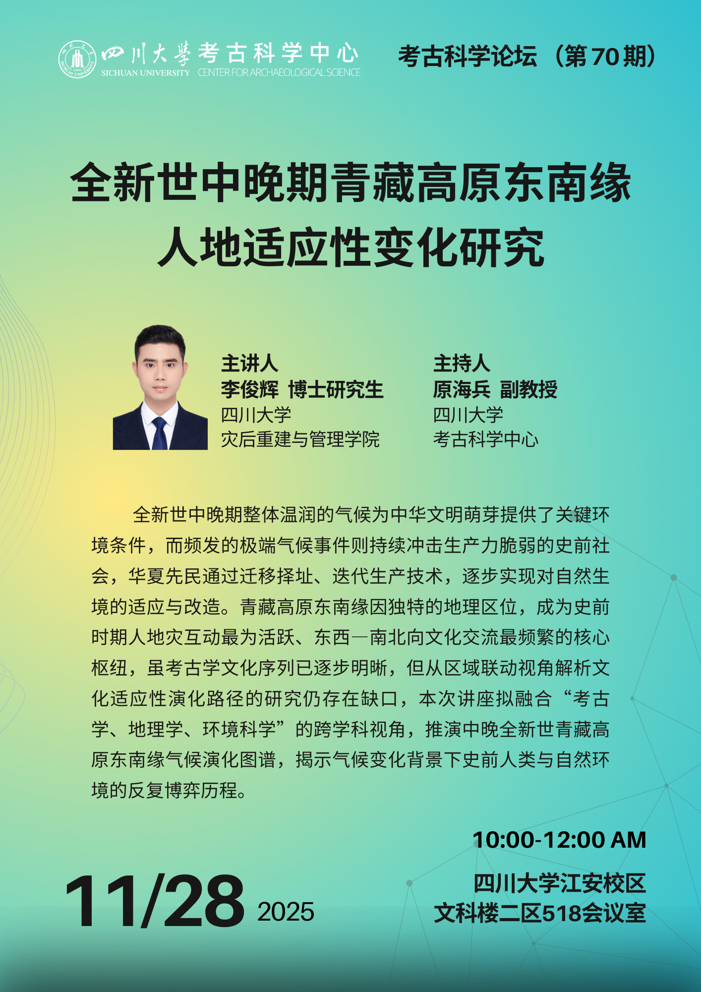 考古科学论坛(第 70 期)全新世中晚期青藏高原东南缘人地适应性变化研究主讲人: 李俊辉 博士研究生(四川大学 灾后重建与管理学院)主持人: 原海兵 副教授(四川大学 考古科学中心)主讲内容简介:全新世中晚期整体温润的气候为中华文明萌芽提供了关键环境条件,而频发的极端气候事件则持续冲击生产力脆弱的史前社会,华夏先民通过迁移择址、迭代生产技术,逐步实现对自然生境的适应与改造。青藏高原东南缘因独特的地理区...