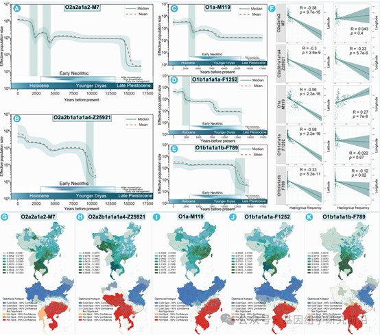 (2)精准重建东亚南向迁徙核心父系奠基者谱系及其扩张时间窗口:研究明确识别出O1a-M119、O1-F1252、O1-F789、O2-M7、O2-Z25921五大单倍群,这些单倍群构成了农业人群南向迁徙的核心父系谱系。贝叶斯天际线图分析显示,上述谱系均在距今约4000至3500年间经历了显著的有效群体扩张。研究从父系遗传视角证实了农业技术革新是中国南方族群人口扩张与南向扩散的根本驱动力。
