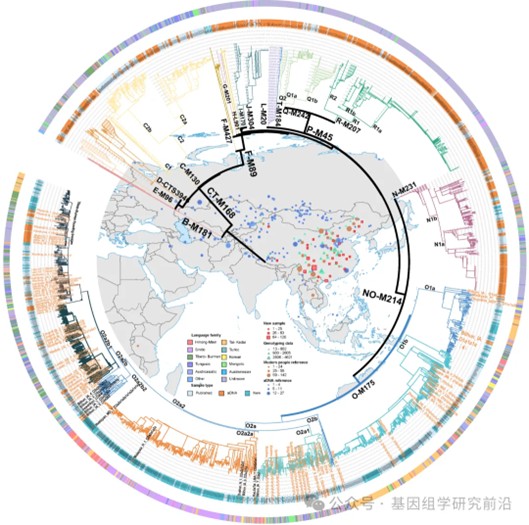 图1. Y染色体系统发育树及本研究中古代和现代样本的地理分布。