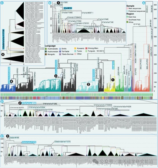 图3. 时间校准的Y染色体系统发育树揭示东亚和东南亚人群的分化与扩张模式。