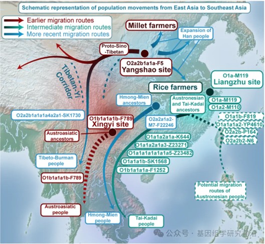 图7. 从东亚到东南亚的南向人群迁徙总体模式。