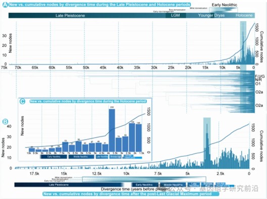图5. 东亚Y染色体系统发育树中此前未知节点与累积节点的随时间变化模式。