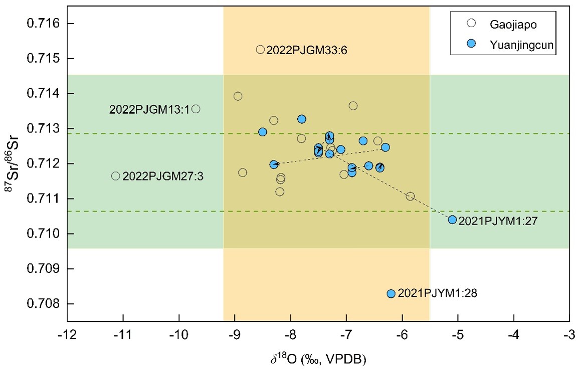 图3 高家坡和远景村崖墓人牙釉质锶、氧同位素值