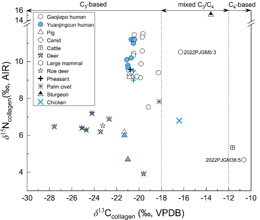 人和动物骨胶原碳、氮同位素结果显示(图2),高家坡和远景村大部分个体呈现C3饮食信号(即以水稻为主),并摄入一定比例的动物蛋白资源。这一饮食结构明显不同于同时期黄河流域以粟类为主的C4农业体系,表明该人群已融入四川盆地以稻作为核心的农业经济体系。