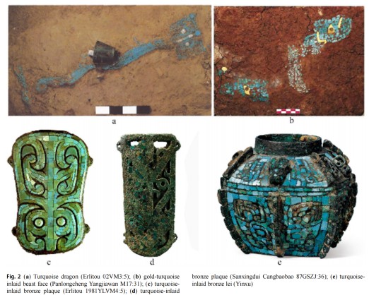 图2 左:(a) 绿松石龙(二里头 02VM3:5);(b)金片绿松石镶嵌饰(盘龙城杨家湾M17:31);(c) 绿松石铜牌饰(二里头1981YLVM4:5);(d) 绿松石铜牌饰(三星堆仓包包87GSZJ:36);(e) 嵌绿松石容器(殷墟)。右:三星堆出土绿松石嵌片
