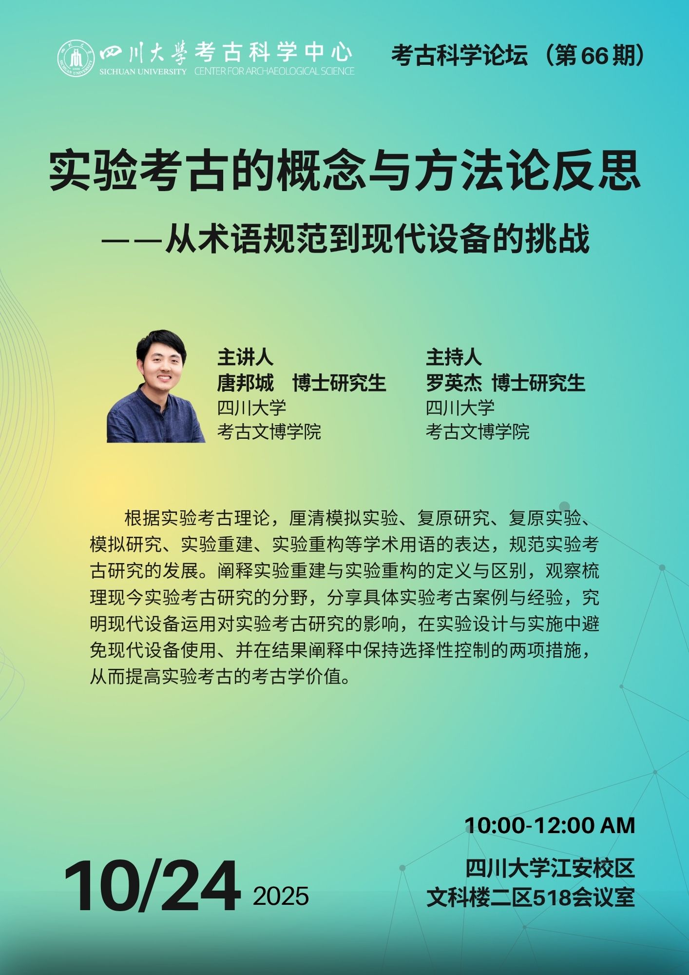 Archaeological Science Forum No. 66Reflections on the Concepts and Methodology of Experimental Archaeology – From Terminology Standardization to the Challenges of Modern EquipmentSpeaker: Dr. Tang Bangcheng, PhD Candidate (School of Archaeology and Museology, Sichuan University)Moderator: Dr. Luo Yingjie, PhD Candidate (School of Archaeology and Museology, Sichuan University)Abstract:Based on ...