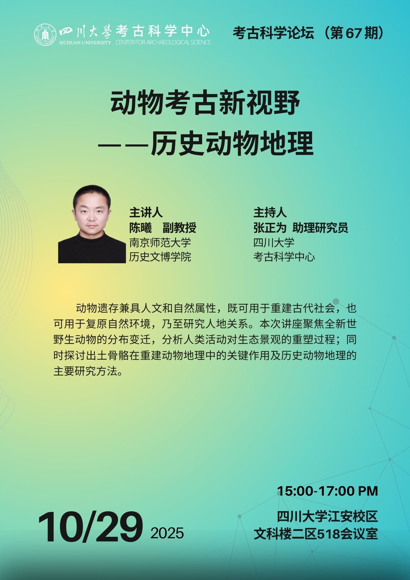 Archaeological Science Forum (No. 67)New Perspectives in Zooarchaeology: Historical ZoogeographySpeaker: CHEN Xi, Associate Professor (School of History and Culture, Nanjing Normal University)Host: ZHANG Zhengwei, Assistant Research Fellow (Center for Archaeological Sciences, Sichuan University)Abstract:Animal remains possess both cultural and natural attributes, enabling their use in reconstru...