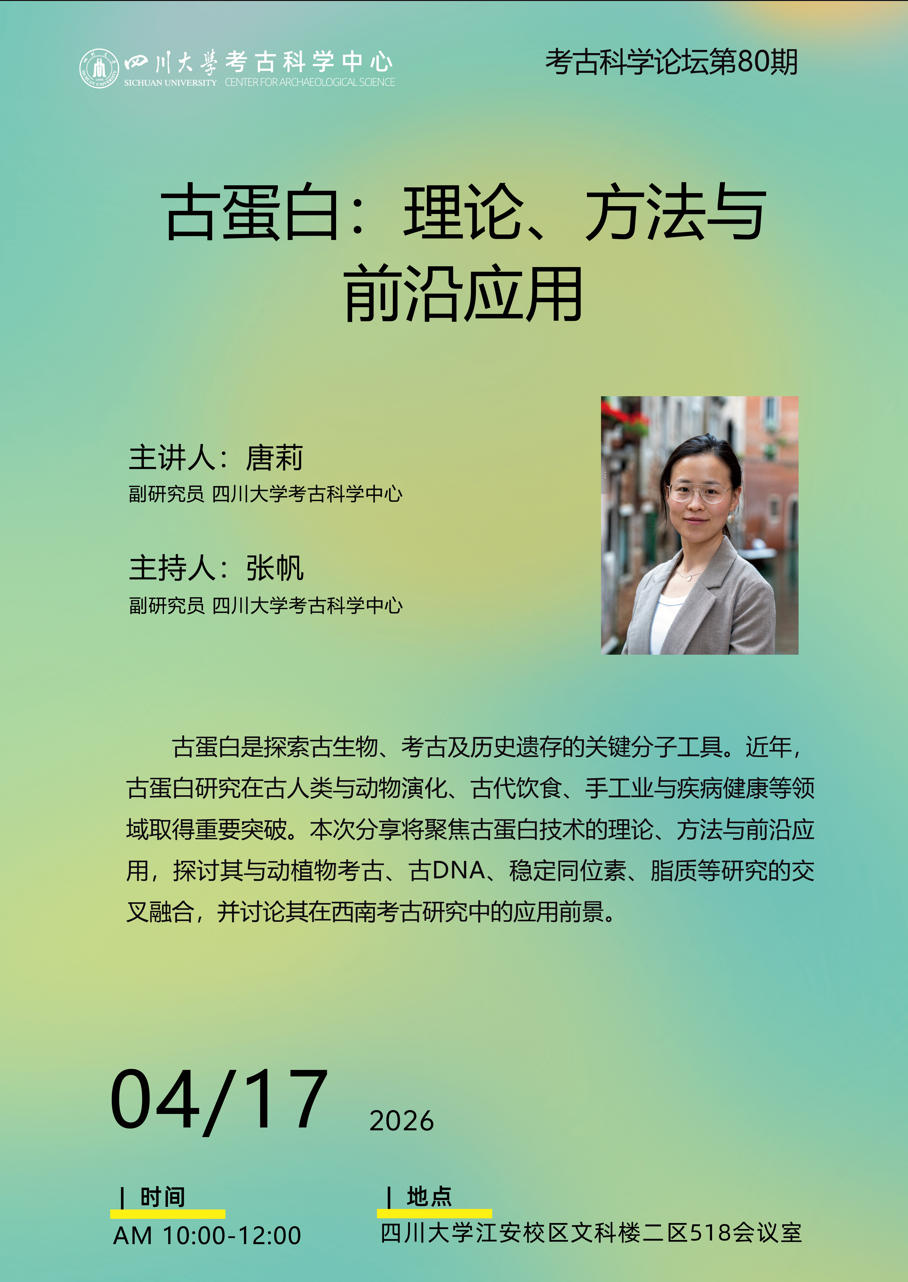 题目:古蛋白:理论、方法与前沿应用主讲人:唐莉 副研究员 四川大学考古科学中心主持人:张帆 副研究员 四川大学考古科学中心主讲内容:古蛋白是探索古生物、考古及历史遗存的关键分子工具。近年,古蛋白研究在古人类与动物演化、古代饮食、手工业与疾病健康等领域取得重要突破。本讲将聚焦古蛋白技术的理论、方法与前沿应用,探讨其与动植物考古、古DNA、稳定同位素、脂质等研究的交叉融合,并讨论其在西南考古研究中的应用前...