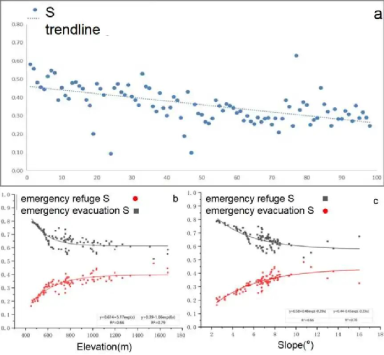 The distribution of disaster prevention space in temples at different altitudes is a key indicator for measuring their disaster resistance capability. The overall proportion of disaster prevention space in temples is 36%, and the Open Space Ratio (OSR) shows a clear linear upward trend with increasing altitude (Fig. 3a). Meanwhile, as the slope increases, the temple OSR gradually rises (Fig. 3b). The OSRs for plain, hillslope, col, mountaintop, and hill-type temples are 29%, 44%, 36%, 43%, and 31%, respectively (Fig. 3c). The OSR of temples in high-topography locations is four times that of those in low-topography locations, indicating that prioritizing high-topography sites during selection can significantly increase open space to alleviate disaster relief pressure (Fig. 3d).