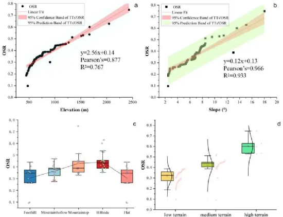 Figure 3. (a) Comparison of temple OSR under different altitude conditions. (b) Comparison of temple OSR on different slopes. (c) Comparison of temple OSR for different types. (d) Comparison of temple OSR in different topographic positions.