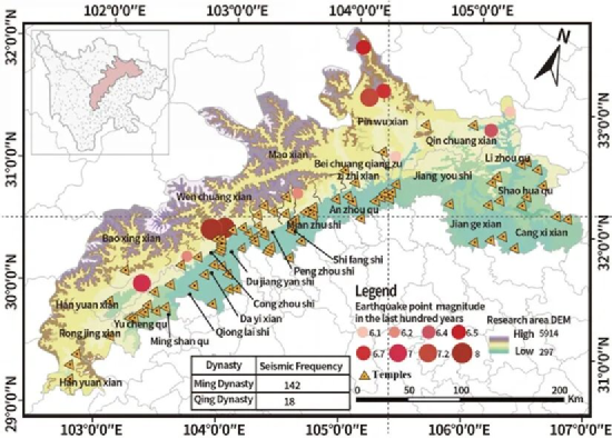 Figure 1. Distribution of earthquake epicenters and Han Dynasty Buddhist temples in the Longmen Mountains, Sichuan