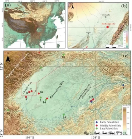 (a. Topography of the Sichuan Basin; b. Location of the Dashanpo site; c. Paleolithic archaeological sites in the Sichuan region)