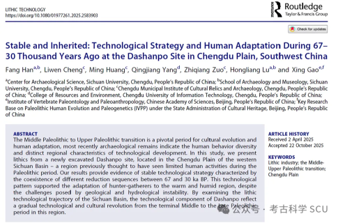 The transition from the Middle to the Late Paleolithic was a critical period for human technological evolution and environmental adaptation. Increasing archaeological discoveries indicate that ancient human behavioral diversity and lithic technological development during this period exhibited distinct regional characteristics. The Chengdu Plain, located in the western Sichuan Basin of Southwest China, was previously thought to lack long-term human activity during the Paleolithic Age due to the influence of the Longmen Mountain tectonic belt and changes in river systems. Recently, the School of Archaeology and Museology at Sichuan University, in collaboration with the Chengdu Municipal Institute of Cultural Relics and Archaeology and the Institute of Vertebrate Paleontology and Paleoanthropology (IVPP) of the Chinese Academy of Sciences, published research findings on the Dashanpo site in *Lithic Technology*. The article is titled "Stable and Inherited: Technological Strategy and Human Adaptation During 67–30 Thousand Years Ago at the Dashanpo Site in Chengdu Plain, Southwest China." Associate Research Fellow Han Fang from the Center for Archaeological Sciences, Sichuan University, is the first author, and Associate Research Fellow Zuo Zhiqiang from the Chengdu Municipal Institute of Cultural Relics and Archaeology is the corresponding author. Co-authors include Associate Research Fellows Cheng Liwen and Huang Ming from the Chengdu Municipal Institute of Cultural Relics and Archaeology, Associate Professor Yang Qingjiang from Chengdu University of Information Technology, Professor Lv Hongliang from the Center for Archaeological Sciences, Sichuan University, and Researcher Gao Xing from the IVPP, Chinese Academy of Sciences. This study reveals the lithic technological landscape of ancient humans in this region from 67,000 to 30,000 years ago, filling a gap in the Paleolithic archaeology of the Chengdu Plain. It provides important empirical evidence for understanding the regional characteristics of the lithic industry in southern China, technological evolution, and adaptive strategies of ancient humans to unstable geological and hydrological environments.
